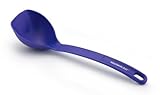 The flat head on this ladle mean no more pan-tilting so you get every last drop, just glide and remove. Flat head ladle means no more pan-tilting so you get every last drop Handle is slender and easy to hold Heat safe to 400 degrees F Bright blue coloring won't get lost in the kitchen Dishwasher safe