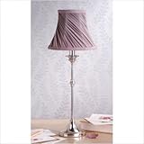 SLC107-BTS013 Shade Color: Mauve Shown with mauve shade Features: -Table lamp. -Shiny silver finish. -Available with mauve or sage shade. -Overall dimensions: 10'' H x 7'' W x 7'' D.