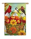 As if this stolen moment between feathered friends was captured just for you, this flag is striking. Three handsome birds perch upon a white picket fence overlooking the bounty of the season. The basket of apples, acorns, and flowers before them overflows with lush beauty. This is a design of autumnal celebration handsomely waving in the wind for the neighborhood to enjoy. 12.5" x 18" Silk Reflections Flag Original design © 2011 Jane Maday / Applejack Art Partners A flag is the greeting card of your home Great for yourself or as a gift