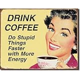 Tin Sign "Coffee - Stupid Things" - Metal sign 16" X 12 1/2" - holes punched in each corner with folded edges. ITEM IS NEW IN BOX WITH FOLDED EDGES FOR EASY MOUNTING ! DREAM HOME DECORATING INSURES ALL ITEMS AT NO COST TO YOU ! 100% GUARANTEED OR YOUR MONEY BACK ITEM IS ONE OF A HUGE SELECTION OF TIN WALL ART AVAILABLE AT LOWEST PRICES ! WE DO OFFER COMBINED SHIPPING PLEASE CLICK ON DREAM HOME DECORATING LINK ABOVE FOR MORE ITEMS!
