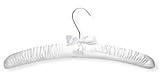 Soft and pretty while still being functional, these thick padded, satin hangers are slightly contoured to keep delicate dresses, lingerie, and shirts perfectly wrinkle-free. Large and strong enough to hold heavy fabrics, they also work well with lighter fabrics. Beautiful satin bow accent adds a touch of luxury and class, while subtle ruching keeps garments with thin straps hanging in place. A gorgeous upgrade to any closet. Size: 17-1/2W x 9-1/2H Inches, Color: Pure White Soft and pretty while still being functional, these thick padded, satin hangers are slightly contoured to keep delicate dresses, lingerie, and shirts perfectly wrinkle-free Large and strong enough to hold heavy fabrics, they also work well with lighter fabrics Beautiful satin bow accent adds a touch of luxury and class, while subtle ruching keeps garments with thin straps hanging in place A gorgeous upgrade to any closet Home organization made easy!