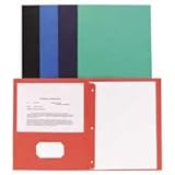 Folders with fasteners feature two pockets that hold loose papers up to 8-1/2" x11". Made from embossed paper stock. Front cover has an embossed title panel. Left pocket has a die-cut business card holder. Three-prong fasteners hold up to 1/2" of punched letter-size papers. Gusset is bound into the report cover.